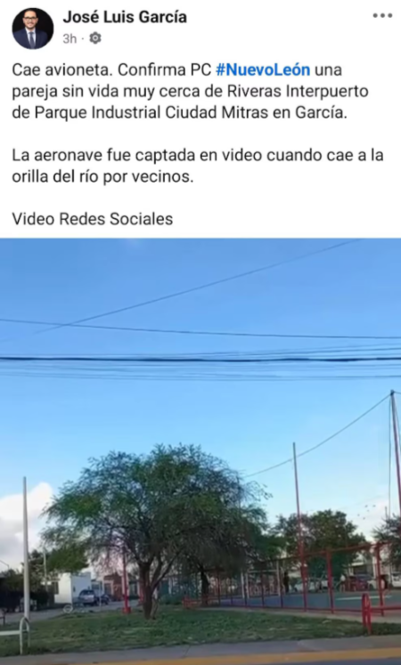 “Cae avioneta. Confirma PC Nuevo León una pareja sin vida muy cerca de Riveras Interpuerto de Parque Industrial Ciudad Mitras en García. La aeronave fue captada en video cuando cae a la orilla del río por vecinos”, informó inicialmente.