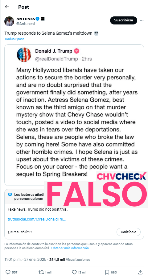 Es falso que Donald Trump haya hecho una publicación sobre Selena Gómez. No hay registros en sus cuentas de Truth Social ni en X que respalden la afirmación, y la viralización se originó tras la reacción de la artista a las deportaciones de migrantes.