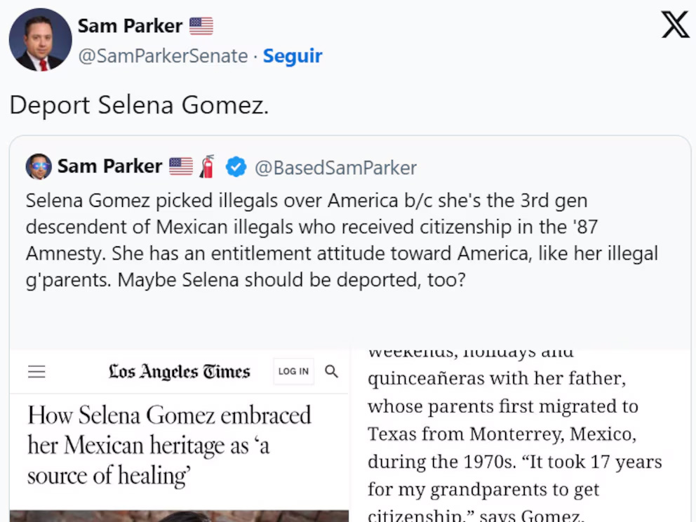 Paralelamente, el político republicano Sam Parker reaccionó al tema en X, pidiendo la deportación de Selena Gómez, lo que pudo haber contribuido a la difusión de información falsa sobre una supuesta declaración de Trump.