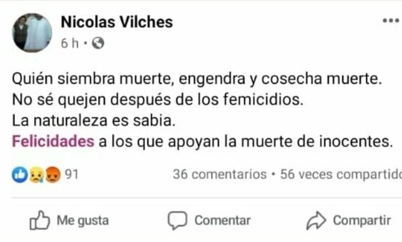 De acuerdo a lo publicado por Página 12, Nicolás Vilches publicó en su cuenta de Facebook que las mujeres no tienen derecho a denunciar los crímenes machistas, a los que sugirió como hechos “naturales”.