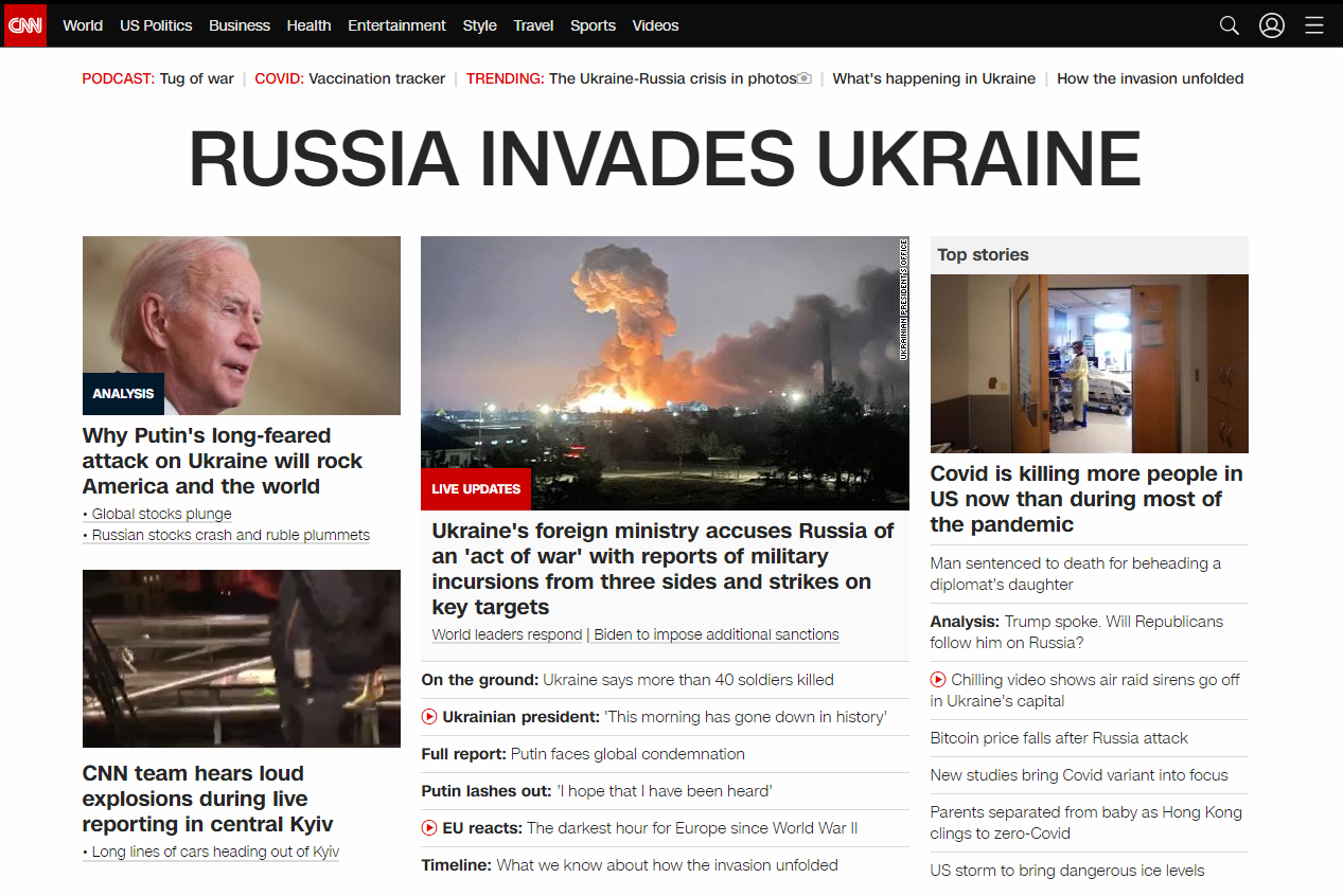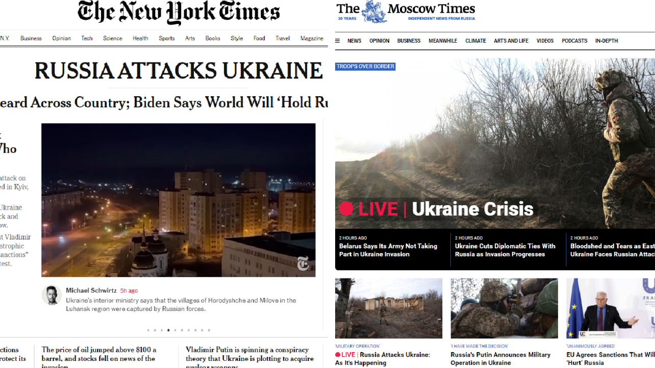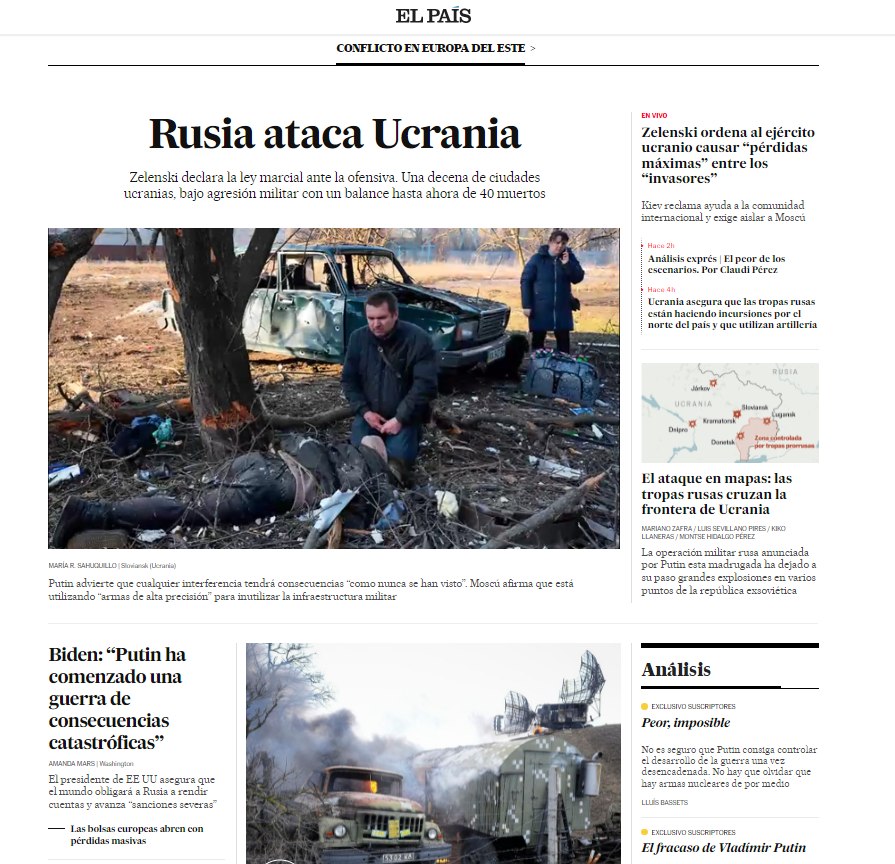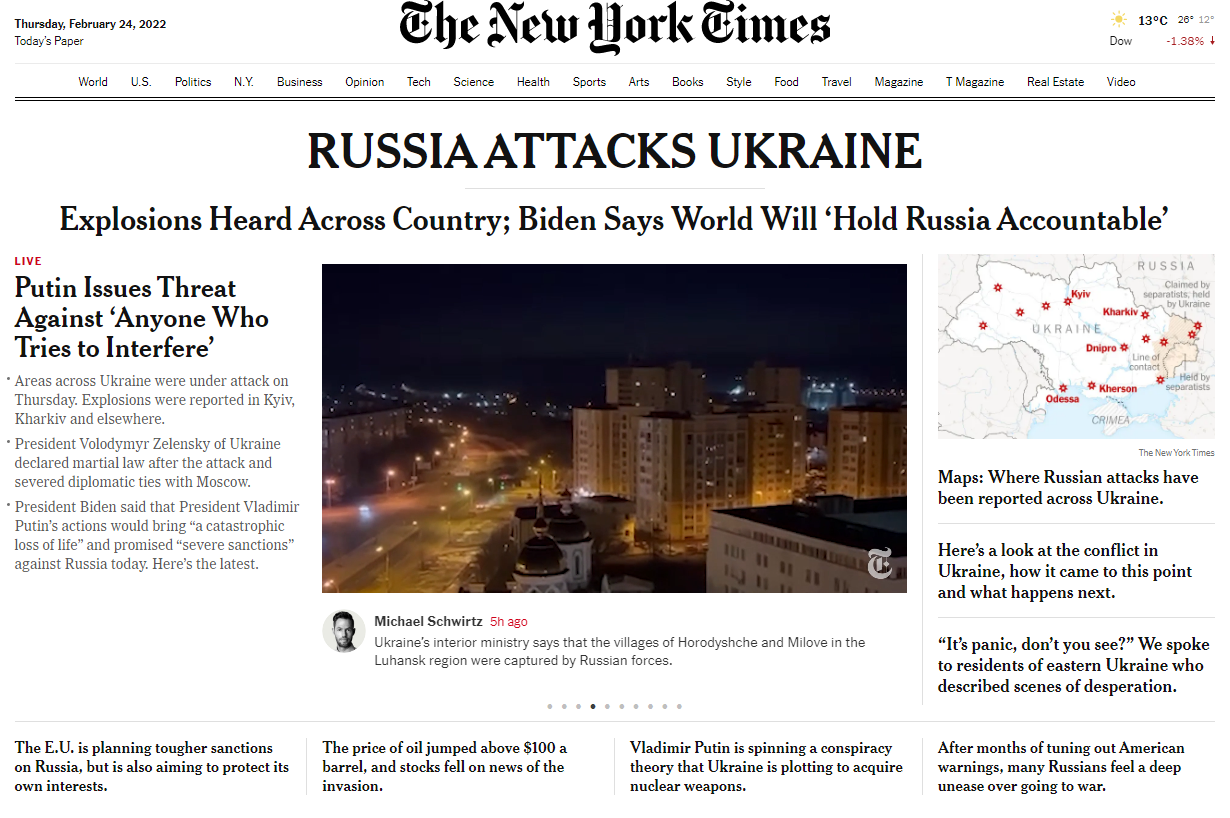 Medios como The New York Times, BBC News, CNN, El País, The Moscow Times o Le Parisien (Francia), son solo algunos de los que han dedicado sus portadas al ataque iniciado por Rusia.
