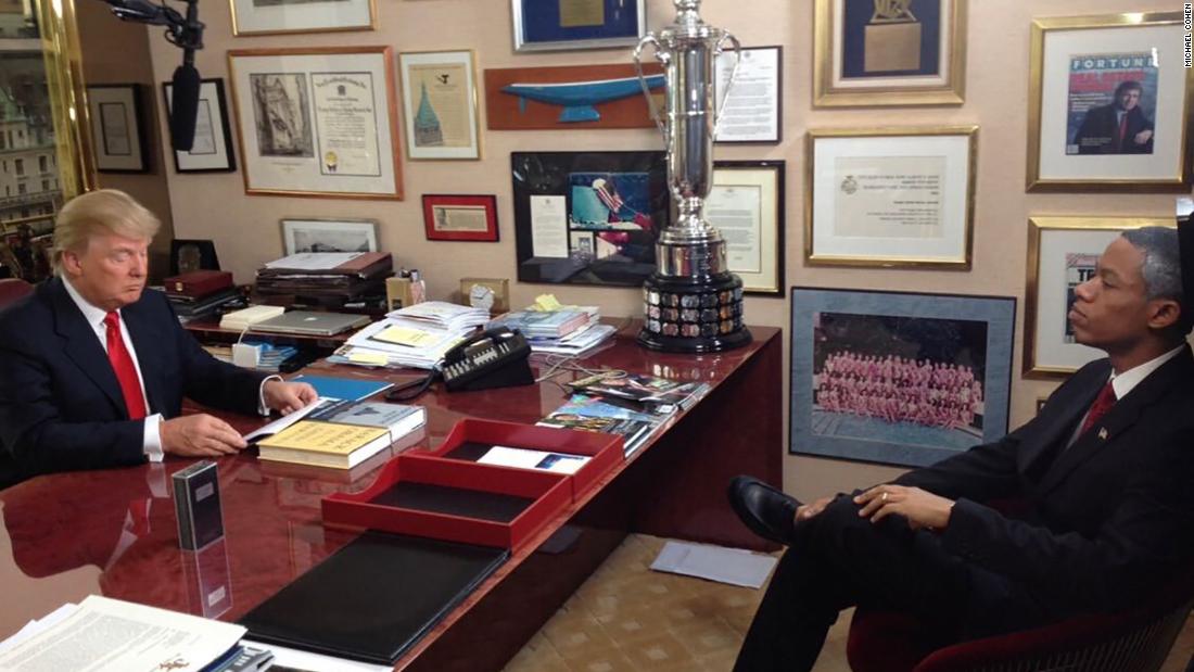 El libro de Cohen, "Disloyal: A Memoir", no nombra al hombre que supuestamente fue contratado para interpretar a Obama ni proporciona una fecha específica para el incidente, pero sí incluye una fotografía de Trump sentado detrás de un escritorio, frente a un hombre negro que usa un traje con un alfiler de bandera estadounidense pegado a la solapa. Sobre el escritorio de Trump hay dos libros, uno con el nombre de Obama en letras grandes.