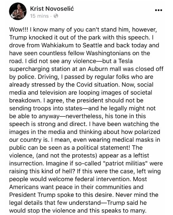 Lee también: Franceses se suman a protestas contra el racismo por muerte de Adama Traoré por presunta acción de la policíaNovoseliv, otrora rebelde del grunge, pidió que se detuvieran las protestas: “La mayoría de los estadounidenses quieren la paz en sus comunidades y el presidente Trump habló sobre ese deseo. No importan los detalles legales que pocos entienden: Trump dijo que detendría la violencia y habla por muchos".