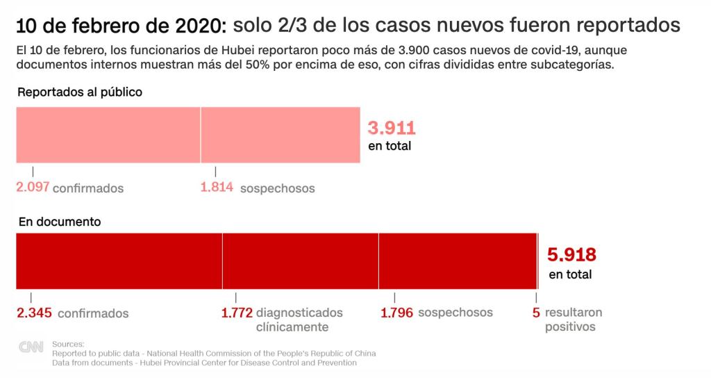 Desde una habitación segura a unos 1.200 kilómetros del epicentro, Xi expresó sus condolencias a quienes murieron en el brote. Instó a una mayor comunicación pública, pues en todo el mundo aumentaban las preocupaciones sobre la posible amenaza que representaba la nueva enfermedad.Ese mismo día, las autoridades chinas reportaron 2.478 nuevos casos confirmados, lo que elevaba el número total mundial a más de 40.000, y menos de 400 casos había fuera de China continental. Sin embargo, CNN ahora puede revelar cómo los documentos oficiales que circularon internamente muestran que esto era solo una parte de la imagen.