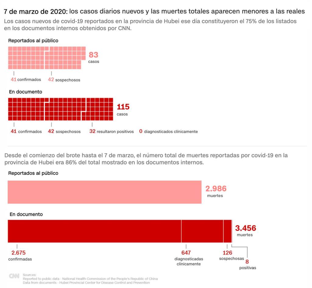 Las cifras de muertes que figuran en los documentos revelan las discrepancias más marcadas. El 7 de marzo, el número total de muertos en Hubei desde el comienzo del brote era de 2.986, pero en el informe interno figuran 3.456, incluidas 2.675 muertes confirmadas, 647 muertes "diagnosticadas clínicamente" y 126 casos de muertes "sospechosas".