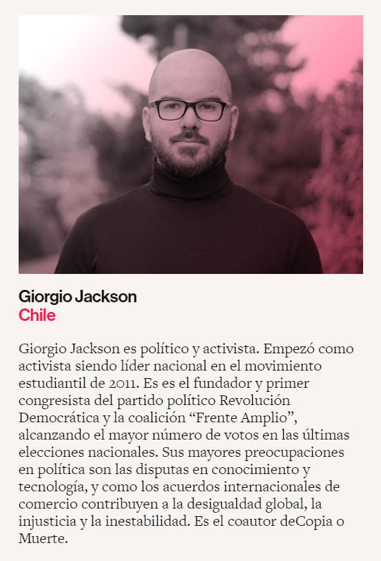 El diputado Giorgio Jackson (RD) también es parte de este consejo. "Empezó como activista siendo líder nacional en el movimiento estudiantil de 2011. Es el fundador y primer congresista del partido político Revolución Democrática y la coalición 'Frente Amplio', alcanzando el mayor número de votos en las últimas elecciones nacionales", describen desde el colectivo al parlamentario.