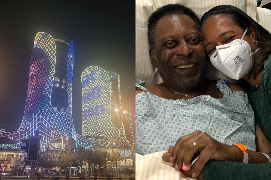 "Mejórate pronto", dice el escrito que iluminó los edificios de la ciudad qatarí, luego de que los hinchas del futbol mundial se preocuparan por las informaciones que señalaban que O Rei fue internado de urgencia.