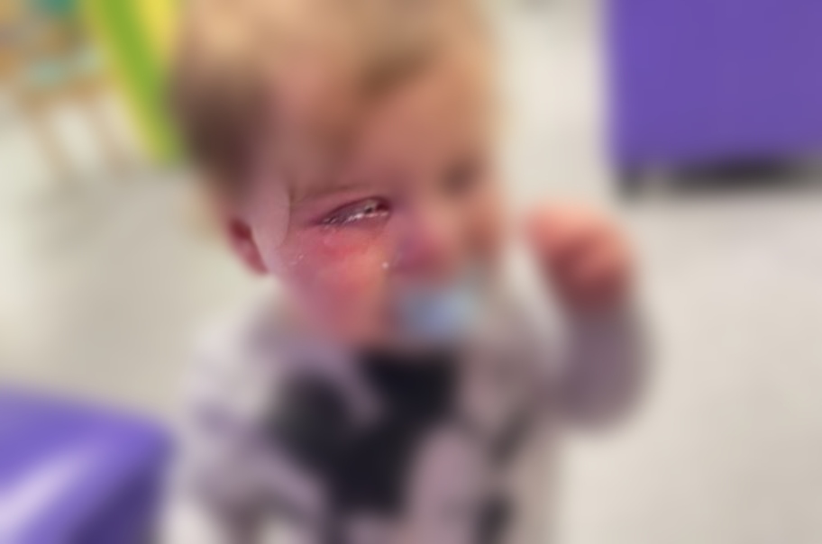El bebé afectado sufrió la hinchazón en parte de su mejilla y sus pestañas quedaron pegadas, debiendo ser llevado a un recinto médico.