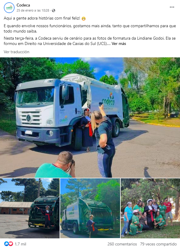 "No se olvidó de este periodo y quiso eternizarlo con fotos en el camión y con sus compañeros del departamento de limpieza urbana (...) Felicidades Lindi por tu lucha y determinación", escribió su empresa en Facebook.