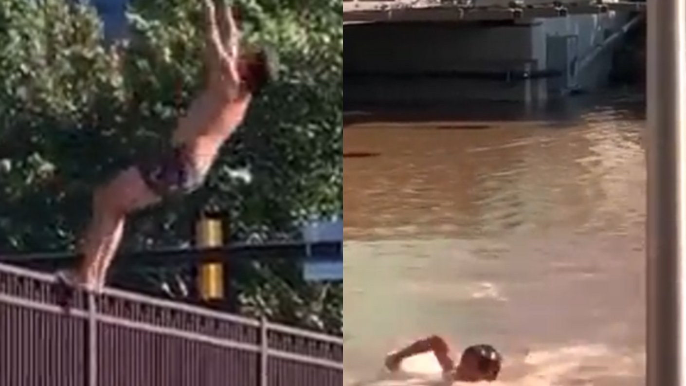 El sujeto realizó una voltereta hacia atrás, cayendo de pie sobre el agua. Otro habitante de la ciudad fue visto navegando por las aguas en un flotador mientras bebía cerveza.