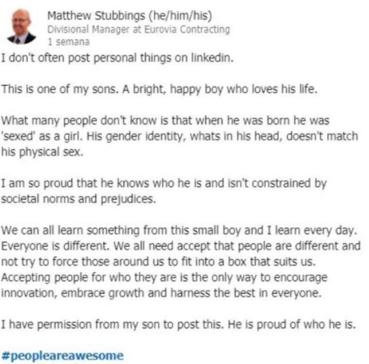 Con esas palabras Matthew Stubbings (44) comentó en su cuenta de LinkedIn su apoyo su hijo Stormy, de ahora cuatro años y que a los dos años le confesó que no se sentía una niña.