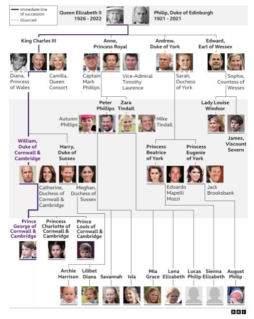 Son 21 personas las que conforman la familia real, entre hijos, nietos y bisnietos. El primero en asumir el cargo más importante es su primogénito Carlos, quien se convirtió en rey de Reino Unido bajo el nombre de Carlos lll.