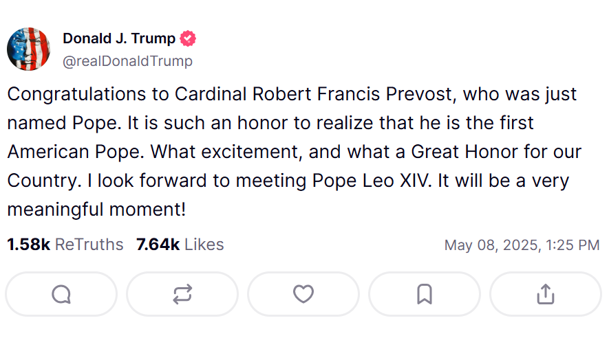"Felicitaciones al Cardenal Robert Francis Prevost, quien acaba de ser nombrado papa. Es un gran honor saber que es el primer papa estadounidense. ¡Qué emoción y qué gran honor para nuestro país! Espero con ansias conocer al Papa León XIV. ¡Será un momento muy significativo!", escribió el presidente de Estados Unidos a través de la red social Truth Social.