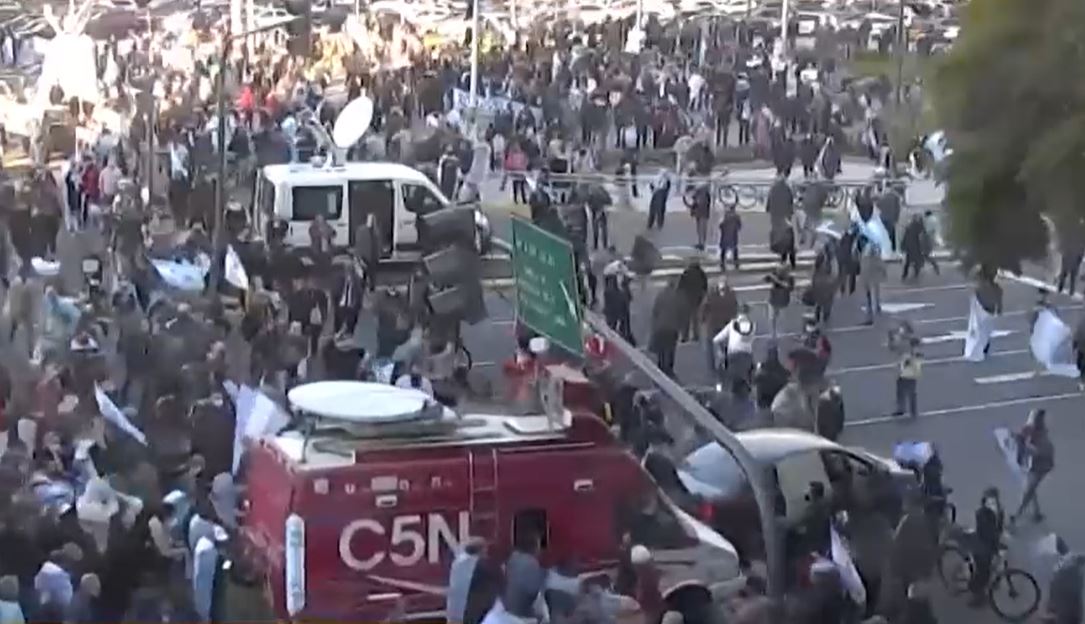 El equipo de prensa de C5N debió refugiarse al interior del vehículo del canal para escapar de las personas, pero eso no fue suficiente. Terminaron retirándose del lugar, ya que les arrojaron objetos y gritaron insultos a través de las ventanas del móvil.