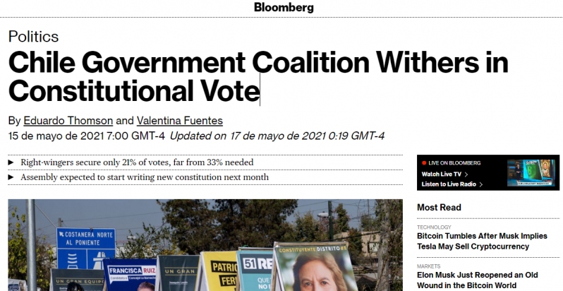 Bloomberg: "La coalición del gobierno chileno pierde fuerza en el voto constitucional"
