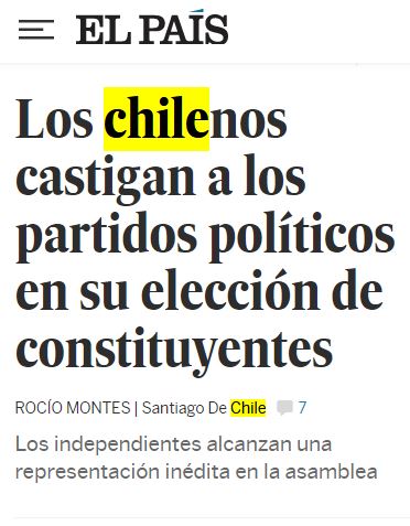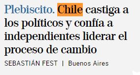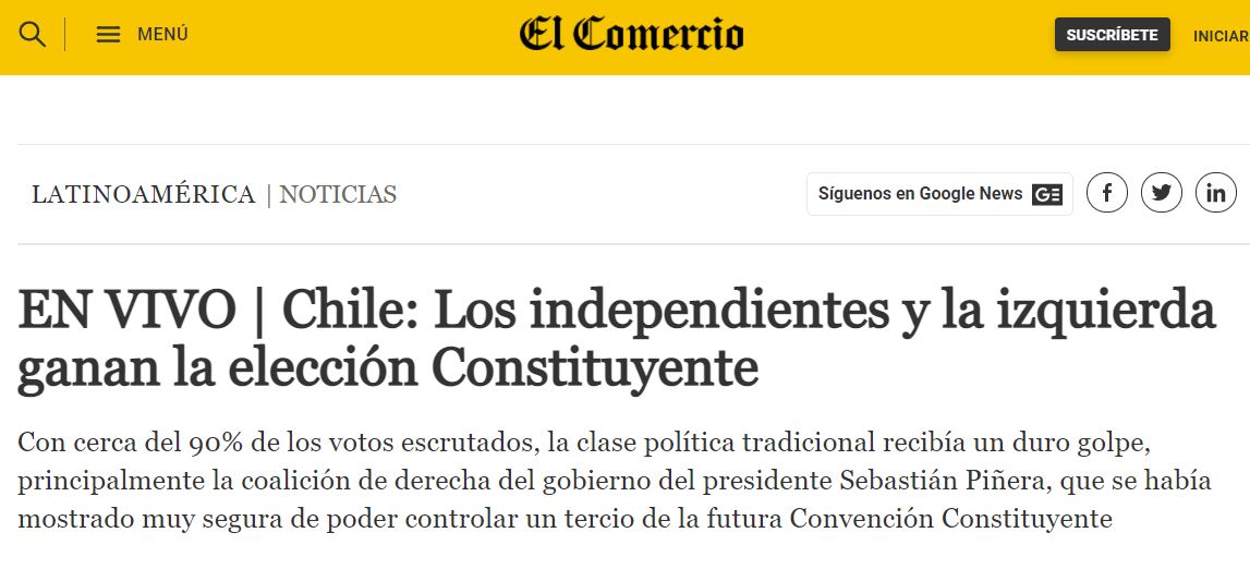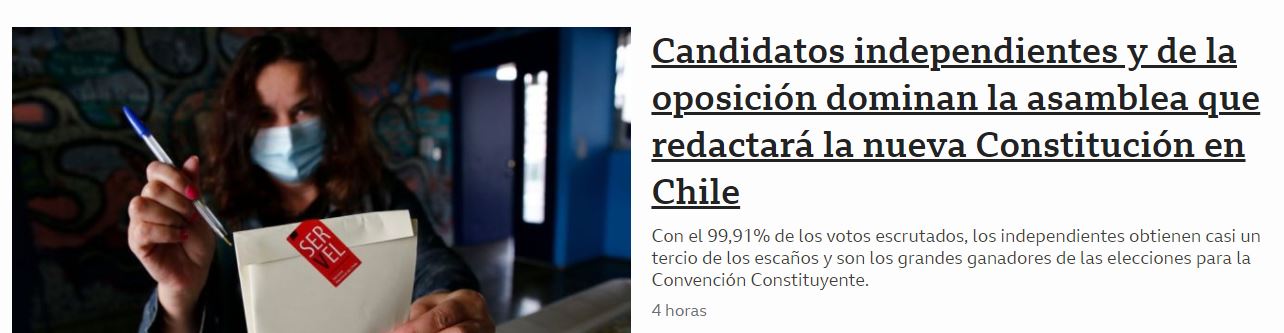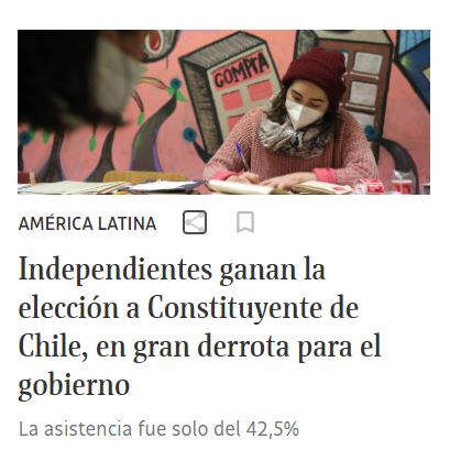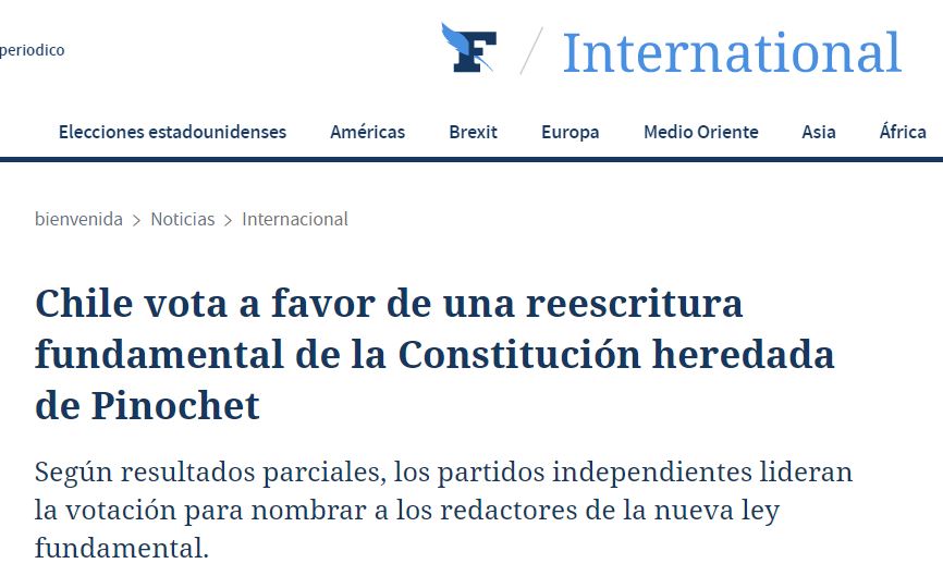 Lee también: Publican calendario con los plazos para instalar la Convención Constitucional The Washington Post, El País, Clarín, Folha y BBC fueron algunos de los que cubrieron las elecciones que se realizaron en dos días en nuestro país.La mayoría de la prensa internacional destacó la alta votación que recibieron los independientes, el castigo a los partidos políticos e incluso el revés que vivieron los aliados del oficialismo.