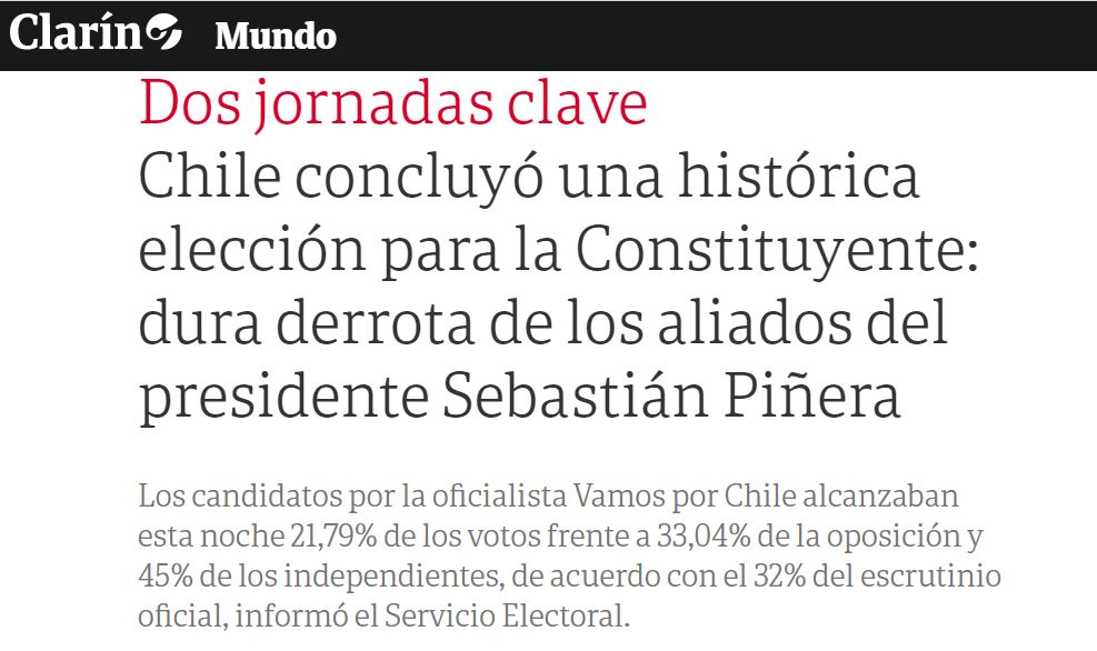 Clarín: "Chile concluyó una histórica elección para la Constituyente: Dura derrota de los aliados del presidente Sebastián Piñera"