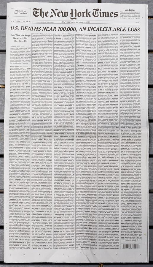 La impactante imagen de la primera página, muy compartida en redes sociales, es una larga lista a seis columnas que pone nombre, edad e historia vital a las crudas cifras de la tragedia bajo el titular "Las muertes en EE.UU. se acercan a 100 mil, una incalculable pérdida", recordando que esas personas "éramos nosotros".
