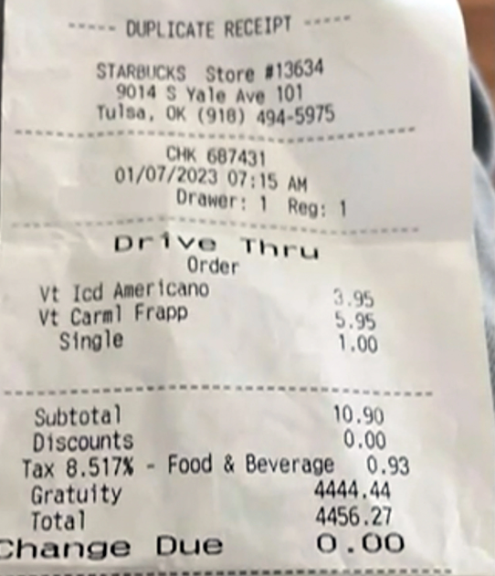 El hecho ocurrió el pasado 7 de enero en un Starbucks en Oklahoma, Estados Unidos, al que acudieron Jesse y Deedee O'Dell, quienes contaron que una compra así ronda los 10 dólares ($8 mil chilenos). Sin embargo, la cuenta les costó 4456,27 dólares, es decir, $3.559.764 chilenos.