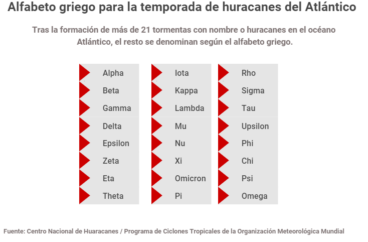 Para nombrar tormentas adicionales, el NHC usará el alfabeto griego, lo que solo ha sucedido una vez desde que el NHC comenzó a nombrar tormentas en 1953. En 2005, el NHC tuvo que usar 6 letras del alfabeto griego para un número récord de tormentas dado que ya había usado las 21 letras disponibles para la agencia en el alfabeto inglés.