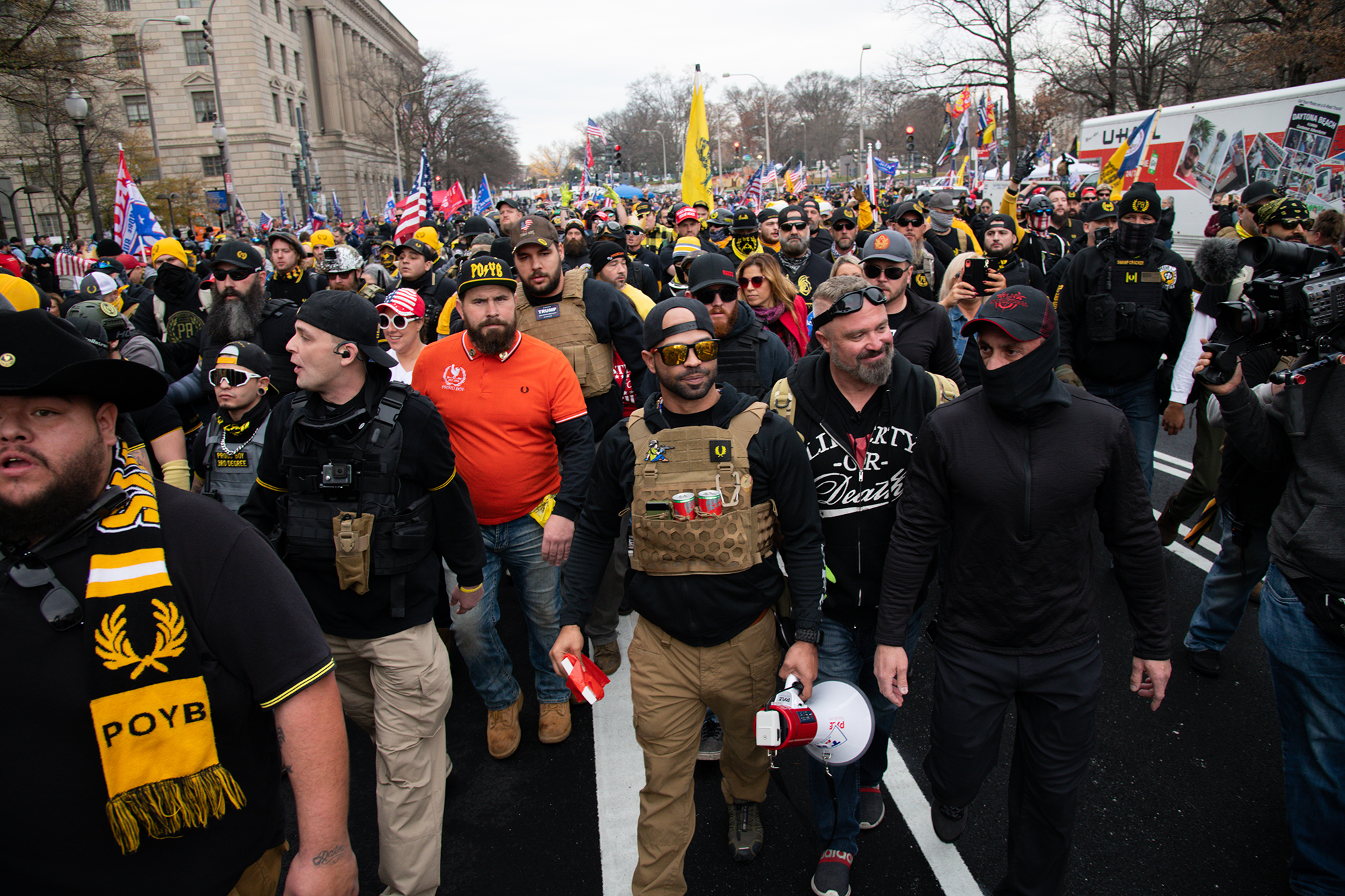 En tanto, los Proud Boys han afirmado que sólo han usado la violencia en defensa propia, pero a menudo se ve a los miembros portando armas de fuego, bates y vistiendo equipo de protección. Algunos han sido condenados por crímenes contra manifestantes antifascistas.