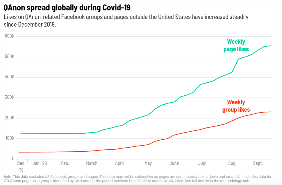 Las teorías -que incluyen campañas anti vacunas y negación del cambio climático- se han extendido a países de Europa y Latinoamérica. Un estudio realizado por CNN muestra el crecimiento explosivo de QAnon a nivel internacional al detectar cerca de 180 grupos de Facebook fuera de Estados Unidos. Alemania, Italia, Francia y Reino Unido tuvieron el mayor crecimiento.