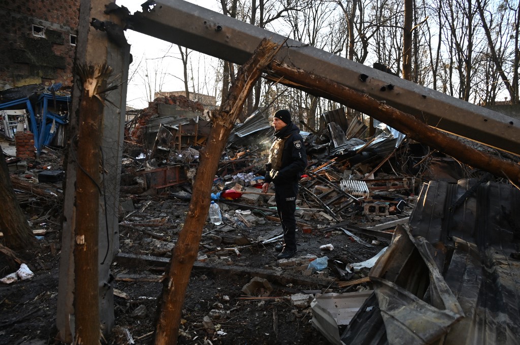 Un policía examina los daños en el exterior de un edificio de apartamentos tras el ataque nocturno con drones rusos en Járkov. (Foto de SERGEY BOBOK / AFP)