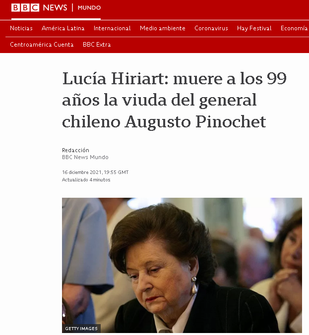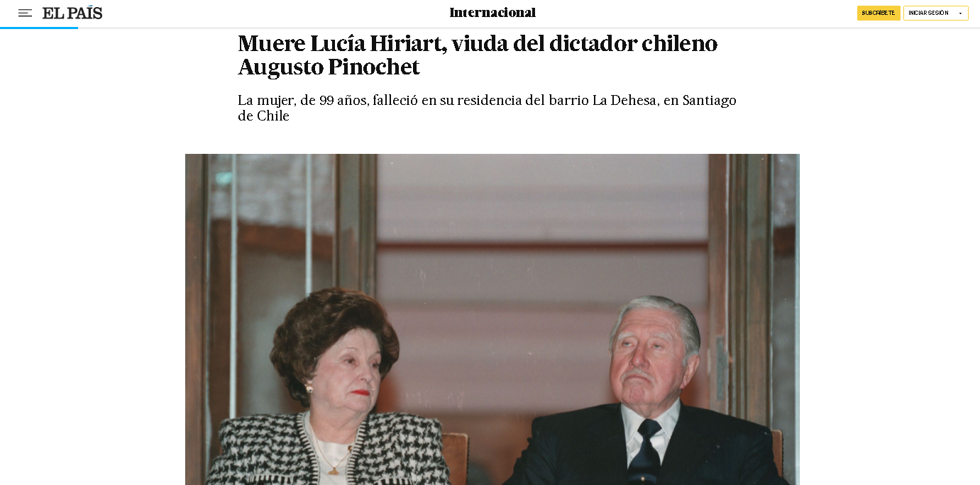Lee también: Esta sería la última aparición de Lucía Hiriart ante la prensa: “Es muy emocionante”En el diario El País, pusieron énfasis en que "el fallecimiento se produce a tres días de una elección polarizada entre Gabriel Boric y José Antonio Kast, un candidato que no ha roto con el régimen de Pinochet".