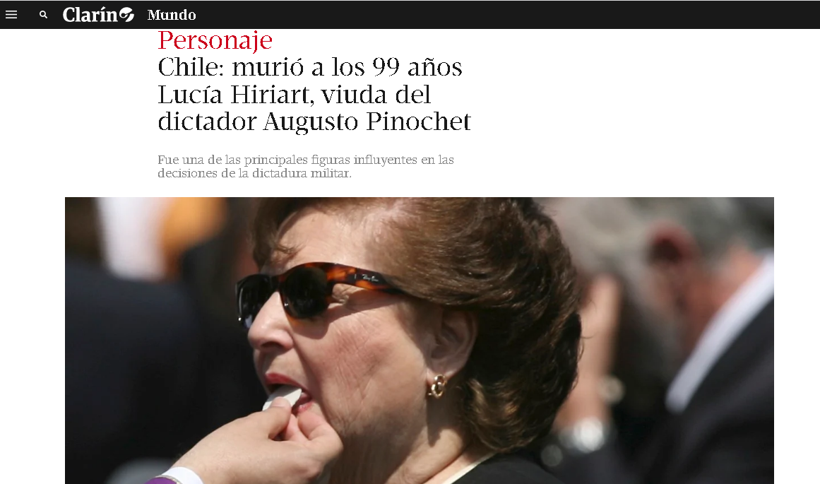 Por su parte, quien también le dio una extensa cobertura a este suceso fue el trasandino El Clarín, quienes titularon "murió a los 99 años Lucía Hiriart, viuda del dictador Augusto Pinochet". Asimismo, en el cuerpo de la noticia, sostuvieron que fue de "las principales figuras influyentes en las decisiones de la dictadura militar" y la tildaron de "controversial".