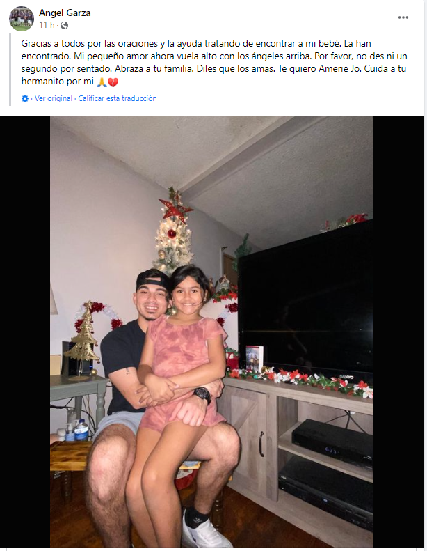 “Gracias a todos por las oraciones y la ayuda tratando de encontrar a mi bebé. Mi pequeño amor ahora vuela alto con los ángeles arriba. Por favor, no des ni un segundo por sentado. Abraza a tu familia. Diles que los amas. Te quiero, Amerie Jo. Cuida a tu hermanito por mí”, escribió.