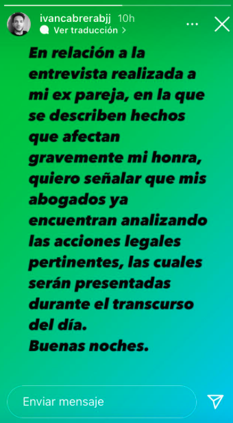 En respuesta, el ex participante de El Discípulo del Chef publicó un breve texto en su cuenta de Instagram en el que señaló que "en relación a la entrevista realizada a mi ex pareja, en la que se describen hechos que afectan gravemente mi honra, quiero señalar que mis abogados ya se encuentran analizando las acciones legales pertinentes”.