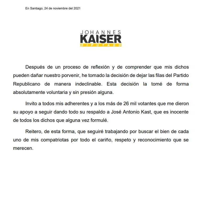 Cabe señalar que previo a esta decisión, José Antonio Kast manifestó su rechazo a "cualquier expresión como la que emitió el diputado electo Johannes Kaiser. También decir, que él hizo una declaración pública donde pidió perdón". En dicho contexto, el abanderado del Partido Republicano informó que "serán entregados todos los antecedentes al Tribunal Supremo del partido" para determinar una resolución al respecto.