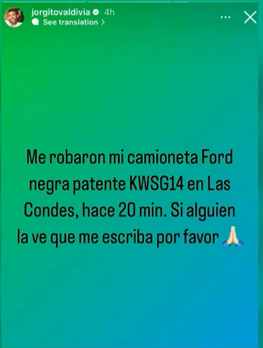 Por medio de su cuenta de Instagram, Valdivia compartió una historia informando que le robaron su camioneta marca Ford de color negra.