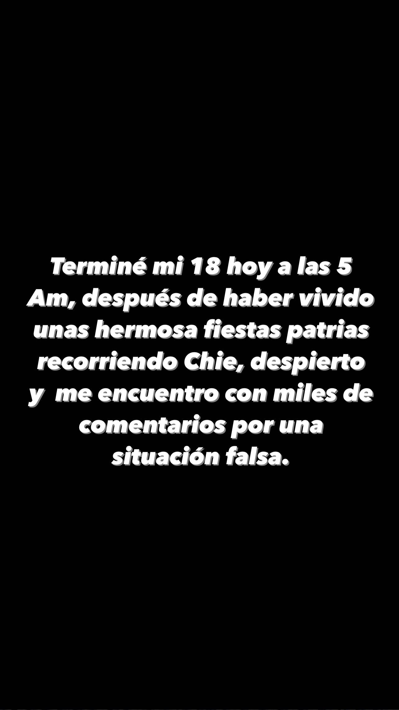 "Terminé mi 18 hoy a las 5 am, después de haber vivido unas hermosas Fiestas Patrias recorriendo Chile. Despierto y me encuentro con miles de comentarios por una situación falsa", comenzó el texto que publicó.