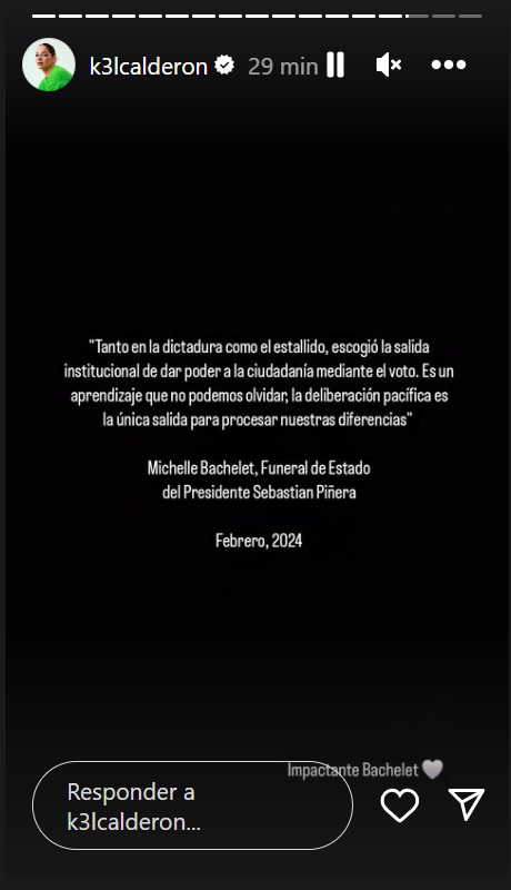 Es un aprendizaje que no podemos olvidar, la deliberación pacífica es la única salida para procesar nuestras diferencias", concluyó Kel, quien solo agregó "impactante Bachelet".