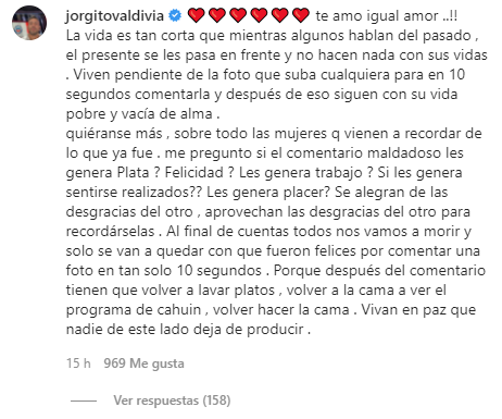 En un largo escrito, Valdivia señaló que "la vida es tan corta que mientras algunos hablan del pasado, el presente se les pasa en frente y no hacen nada con sus vidas".