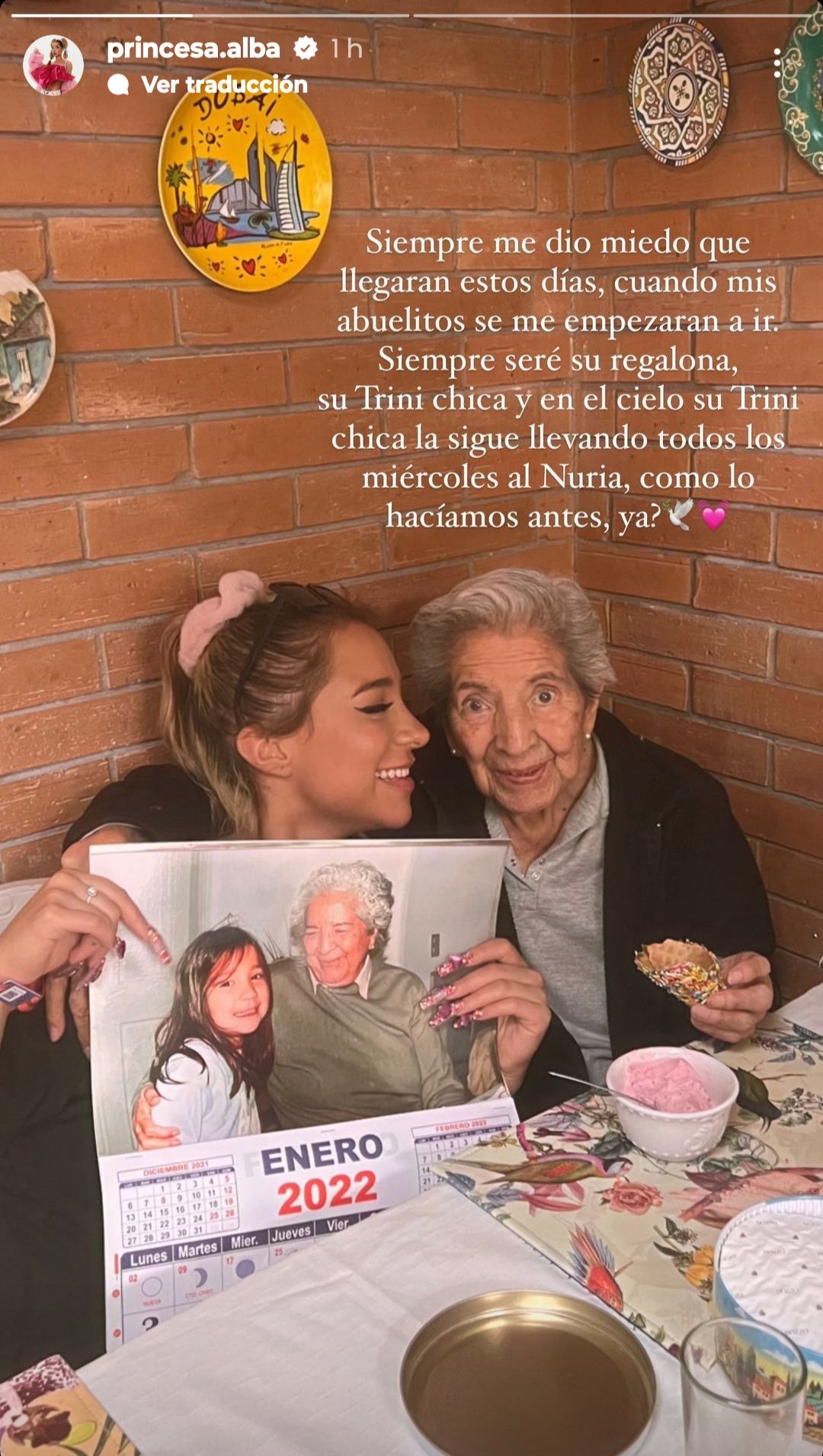 Un doloroso momento personal vive Princesa Alba a raíz de la pérdida de su abuela, quien falleció esta semana, según reveló la cantante a través de sus redes sociales. Precisamente ahí, la artista despidió a su familiar con la publicación de una emotiva fotografía en la que ambas aparecen compartiendo y comiendo en lo que parece ser una once. Para complementar el tierno registro, la intérprete cuyo nombre real es Trinidad Riveros le rindió tributo y escribió un sincero mensaje, dando cuenta del especial vínculo que mantenían. "Siempre me dio miedo que llegaran estos días, cuando mis abuelitos se empezaran a ir", comenzó relatando la autora de Convéncete en su cuenta personal de Instagram. "Siempre seré su regalona, su Trini chica y en el cielo su Trini chica, la sigue llevando todos los miércoles al Nuria, como lo hacíamos antes, ¿ya?", continuó en el mensaje. De esta forma, la intérprete conmemoró a su abuela con dicha historia en la plataforma, mientras que, hasta el cierre de esta nota, la artista no se ha vuelto a referir al delicado momento que atraviesa.