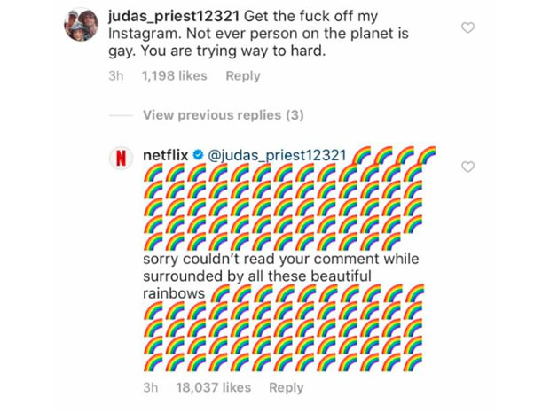 ''Lo siento, no pudimos leer tus comentarios mientras estamos rodeados de todos estos hermosos arcoíris'', escribió la ingeniosa community manager en el mensaje acompañado de emoticones de arcoíris, cuyos colores representan a la comunidad LGTBIQ.