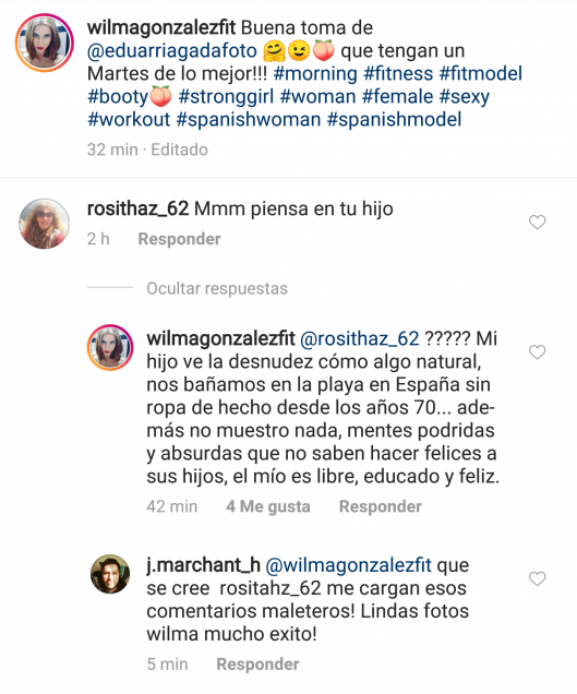 También puedes leer: Wilma González reveló inusual conversación con Nicolás López: “Anda poco vestida”La usuaria de nombre @rosithaz_62 le escribió en una de sus publicaciones “mmm piensa en tu hijo”, lo que desató la molestia de la modelo española.