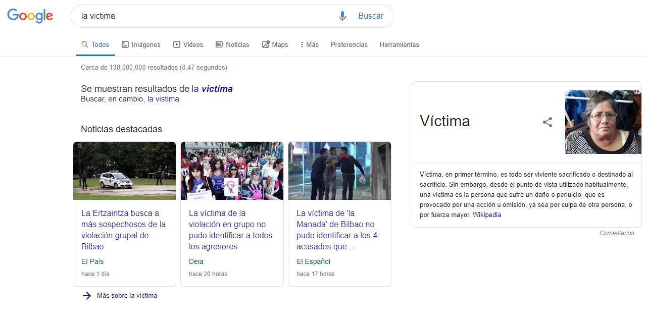 Para eso, hoy el buscador incluye diferentes funciones, destacando los “paneles de conocimiento”, que son los recuadros a la derecha con los datos fundamentales de alguna persona o entidad, en este caso, la definición de "víctima" proporcionada por Wikipedia.