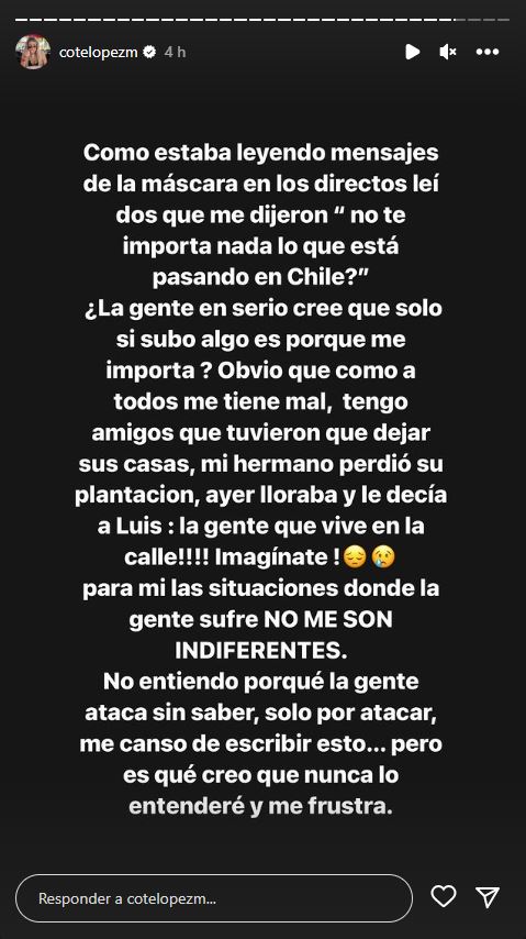 "Cuando estaba leyendo mensajes de la máscara en los directos leí dos que me dijeron '¿no te importa nada lo que está pasando en Chile?'", comenzó diciendo en su historia.
