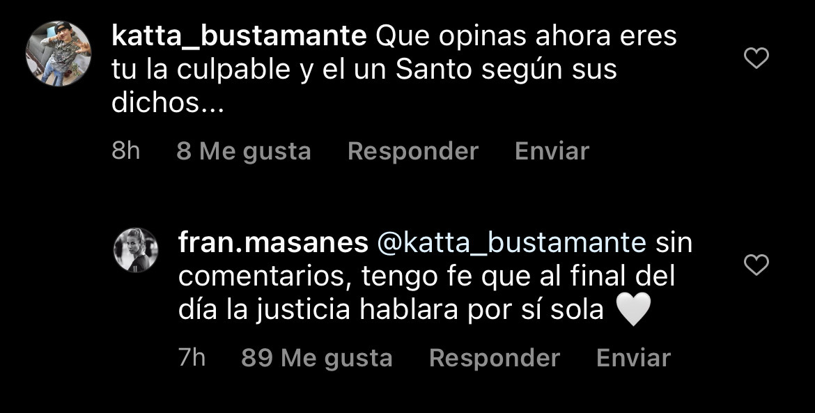 Sin embargo, Masanes también tuvo una opinión respecto de esta defensa pública que hizo su ex pareja. Sus expresiones las emitió en respuesta al comentario de una seguidora en una foto de su Instagram, quien le preguntó “¿qué opinas que ahora eres tú la culpable y él un santo según sus dichos…?”.