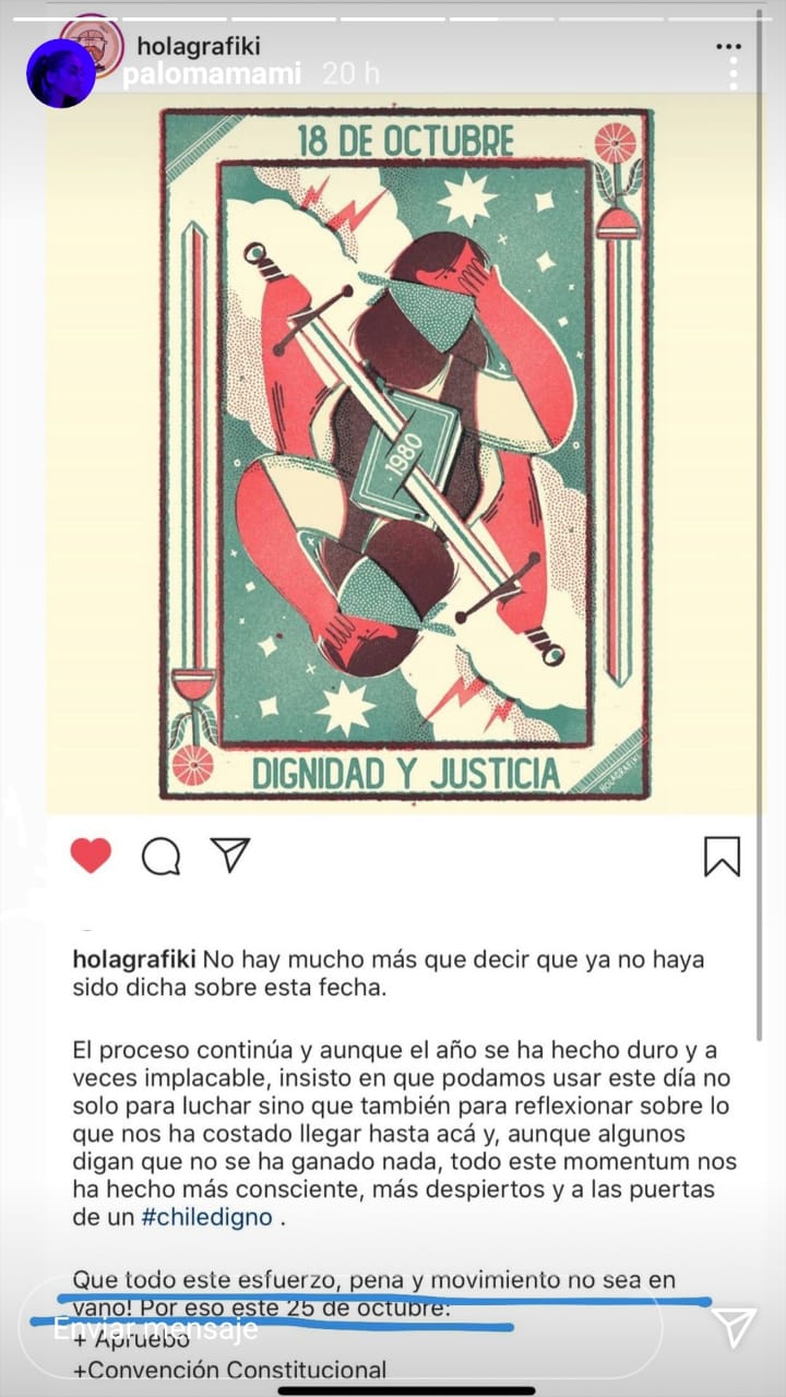 En el marco del primer aniversario del estallido social, la cantante nacional Paloma Mami compartió una serie de fotografías en sus stories de Instagram en alusión a las manifestaciones del 18 de octubre pasado.