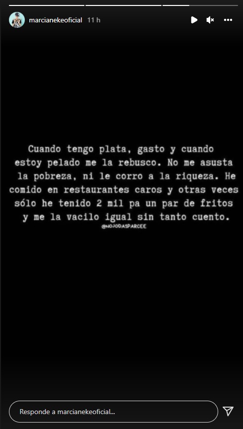 “Cuando tengo plata, gasto y cuando estoy pelado me la rebusco. No me asusta la pobreza, ni le corro a la riqueza. He comido en restaurantes caros y otras veces sólo he tenido dos mil pa' un par de fritos y me la vacilo igual sin tanto cuento”, posteó.