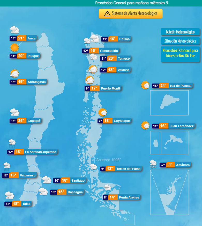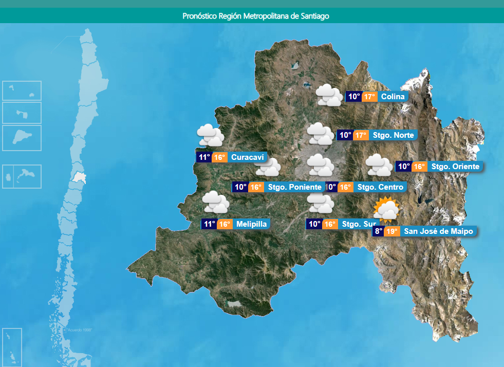 De acuerdo a la Dirección Meteorológica de Chile, este 9 de noviembre la máxima será de solo 16°, mientras que la mínima llegará a los 10° en un día principalmente nublado.