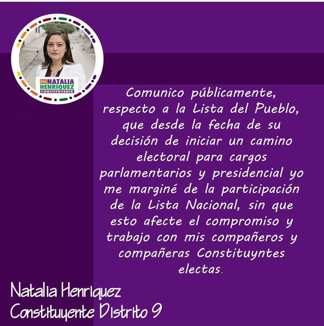 Lee también: Lista del Pueblo reveló cuáles sus precandidatos presidenciales y no incluyeron a Cristián CuevasMisma situación que expresó Natalia Henríquez, constituyente electa del distrito 9. A través de un escueto mensaje, indicó que "desde la fecha de su decisión de iniciar un camino electoral para cargos parlamentarios y presidencial yo me marginé de la participación de la Lista Nacional" de la Lista del Pueblo.