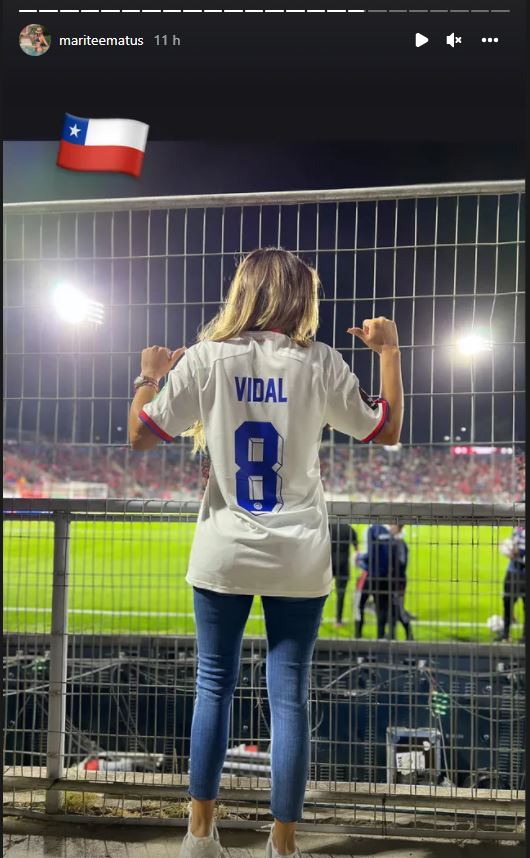 La mujer llegó junto a sus hijos al recinto precordillerano para alentar a la Roja vestida con una polera de su ex esposo, Arturo Vidal, y que tiene el nombre del volante en su espalda.