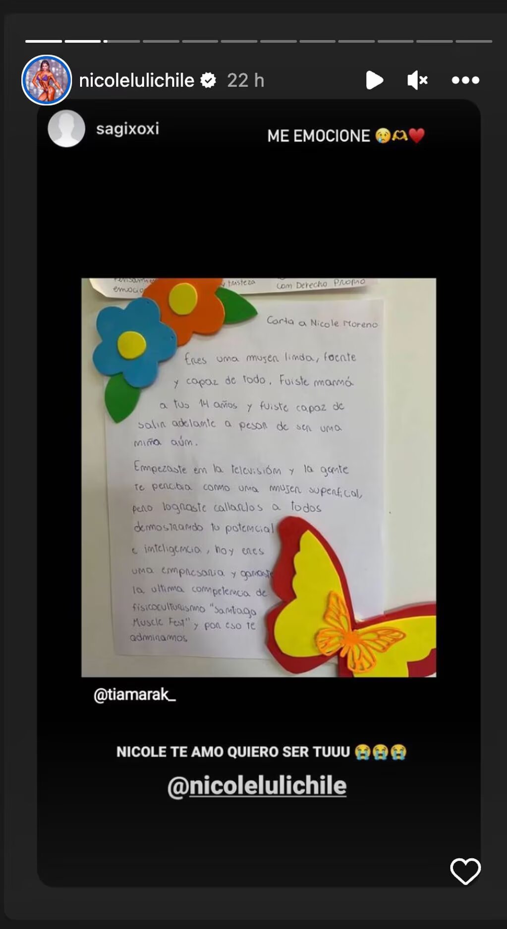 "Hoy eres una empresaria y ganaste tu última competencia de fisicoculturismo ‘Santiago Muscle Fest’ y por eso te admiramos”, cerró la estudiante. Por medio de sus historias en la popular red social, Nicole agradeció el tierno gesto y escribió: “me emocioné”.