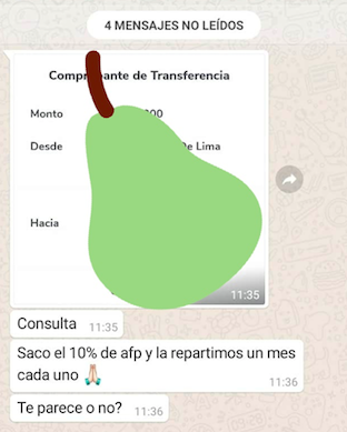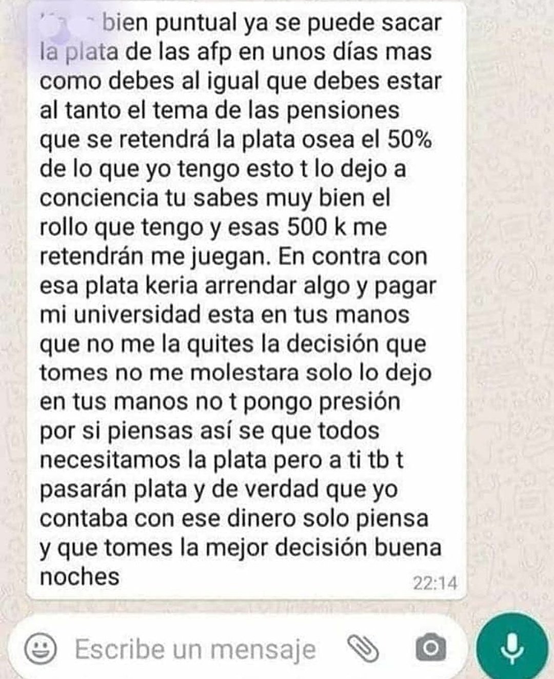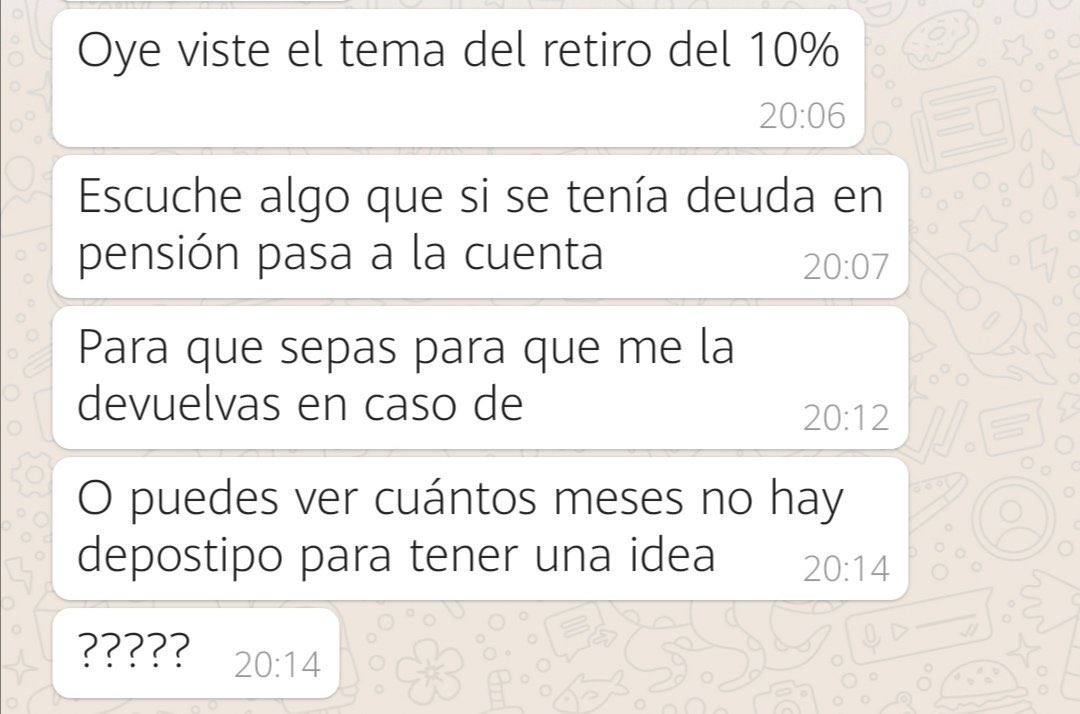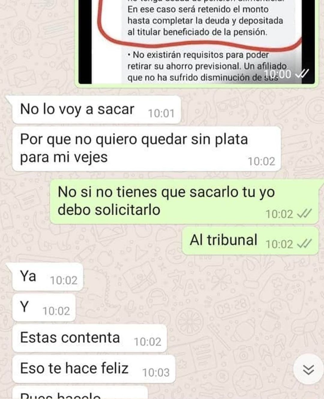 Lee también: Paso a paso: Guía para cobrar el 10% de la AFP del padre que debe la pensión de alimentosUna usuaria de Twitter reunió una serie de pantallazos de conversaciones de WhatsApp en que los padres deudores intentan llegar a un acuerdo con las madres para poder tener acceso a su 10%.