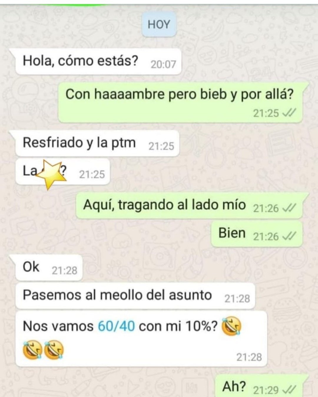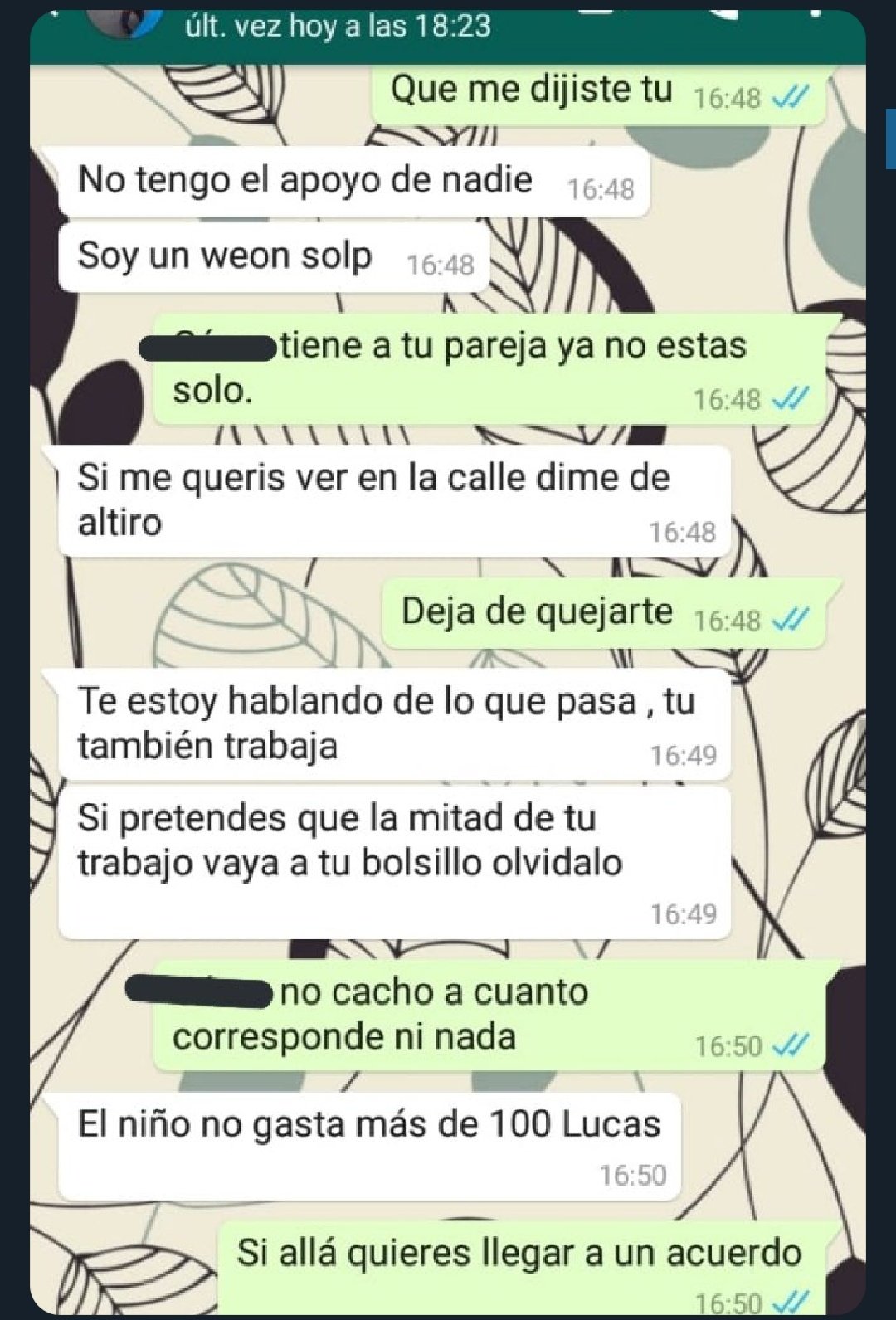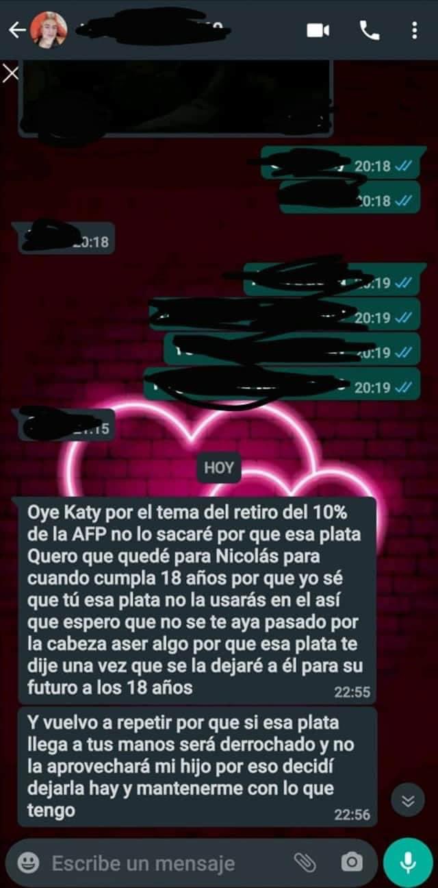 Lee también: Paso a paso: Guía para cobrar el 10% de la AFP del padre que debe la pensión de alimentosUna usuaria de Twitter reunió una serie de pantallazos de conversaciones de WhatsApp en que los padres deudores intentan llegar a un acuerdo con las madres para poder tener acceso a su 10%.